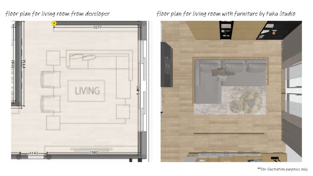 The first thing you should do is look at the floor plan for your space. Knowing the dimension will help you to better visualise your ideal sofa in your living space. Below is an example of a floor plan we got from Eco Ardence’s latest development and how we changed it by adding furniture into the space.