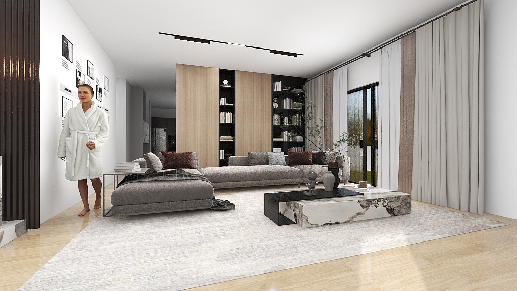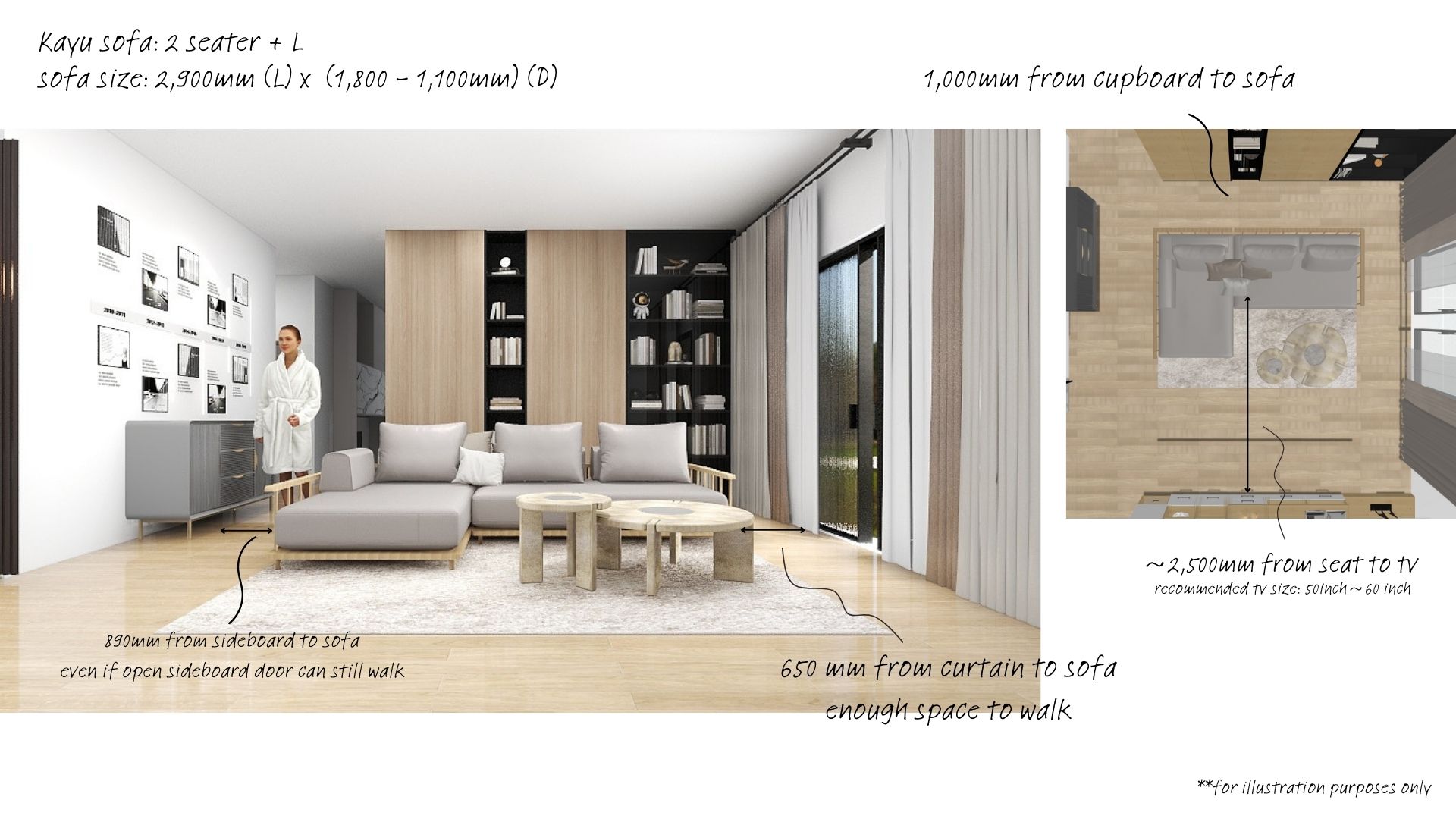 The big sofa does look good in the space. However, there is only 100mm walkway space and we may accidentally knock the sofa everyday trying to maneuver around it.