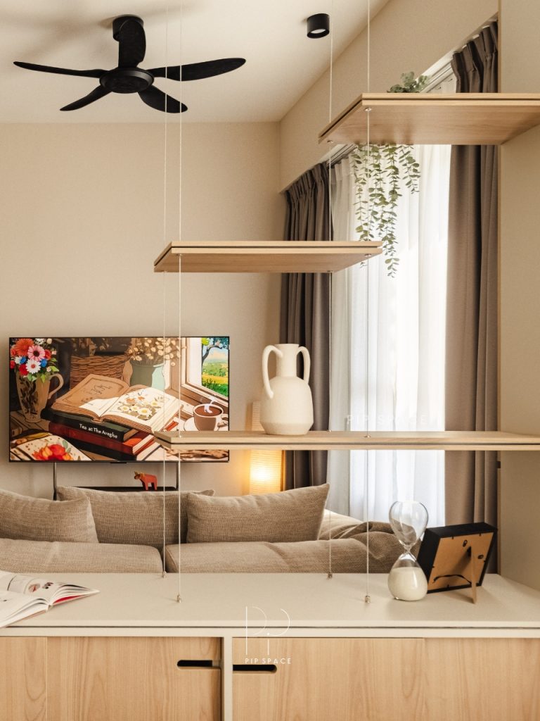 A divider that defines space without enclosure. Floating shelves create a clear distinction between living and bedroom areas while maintaining openness, light, and connectivity. Designed to display cherished objects, the system balances transparency with function, ensuring every inch is used with elegance.