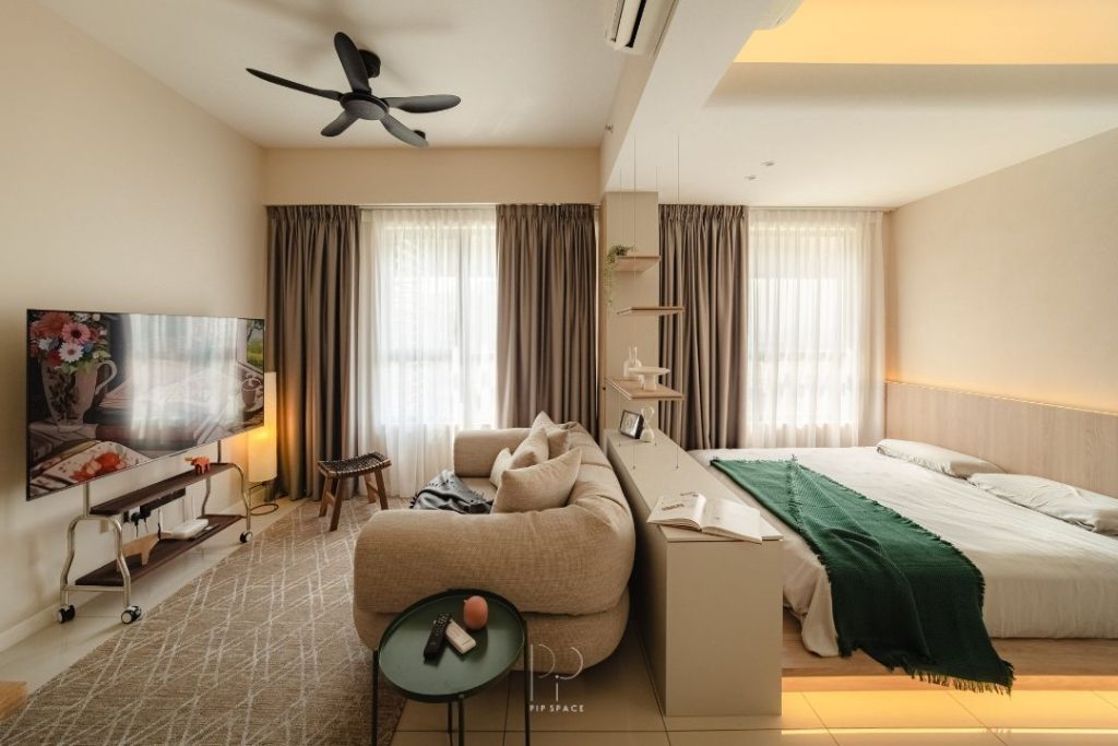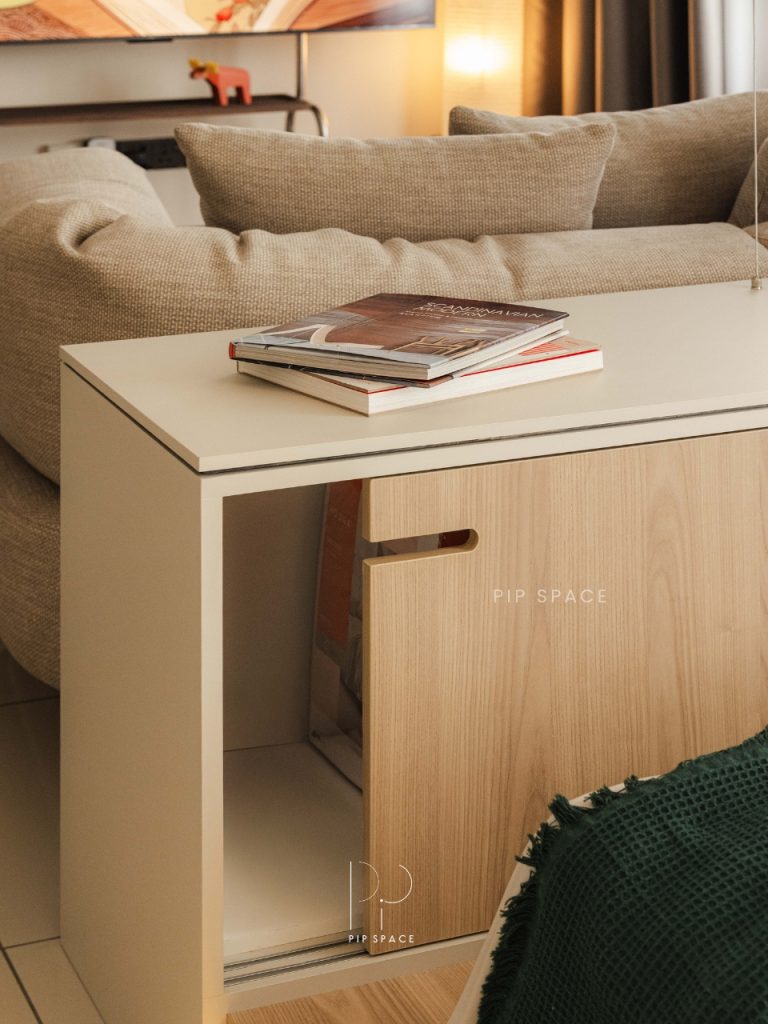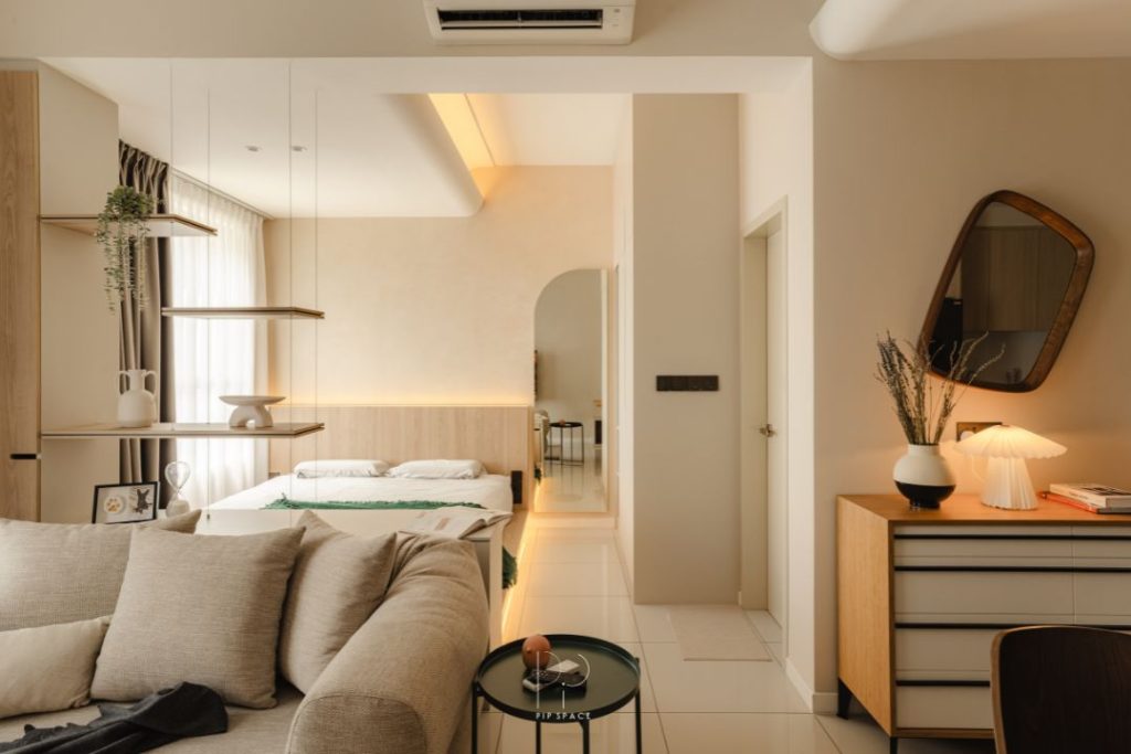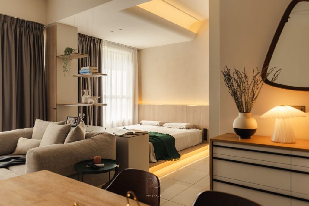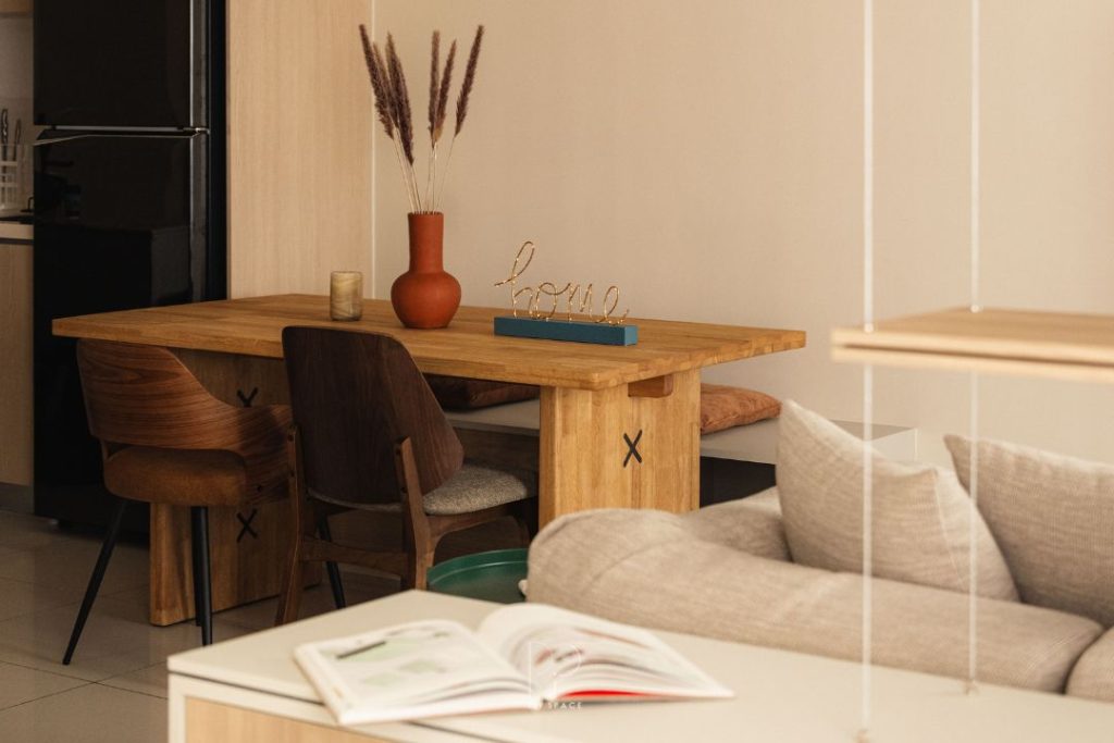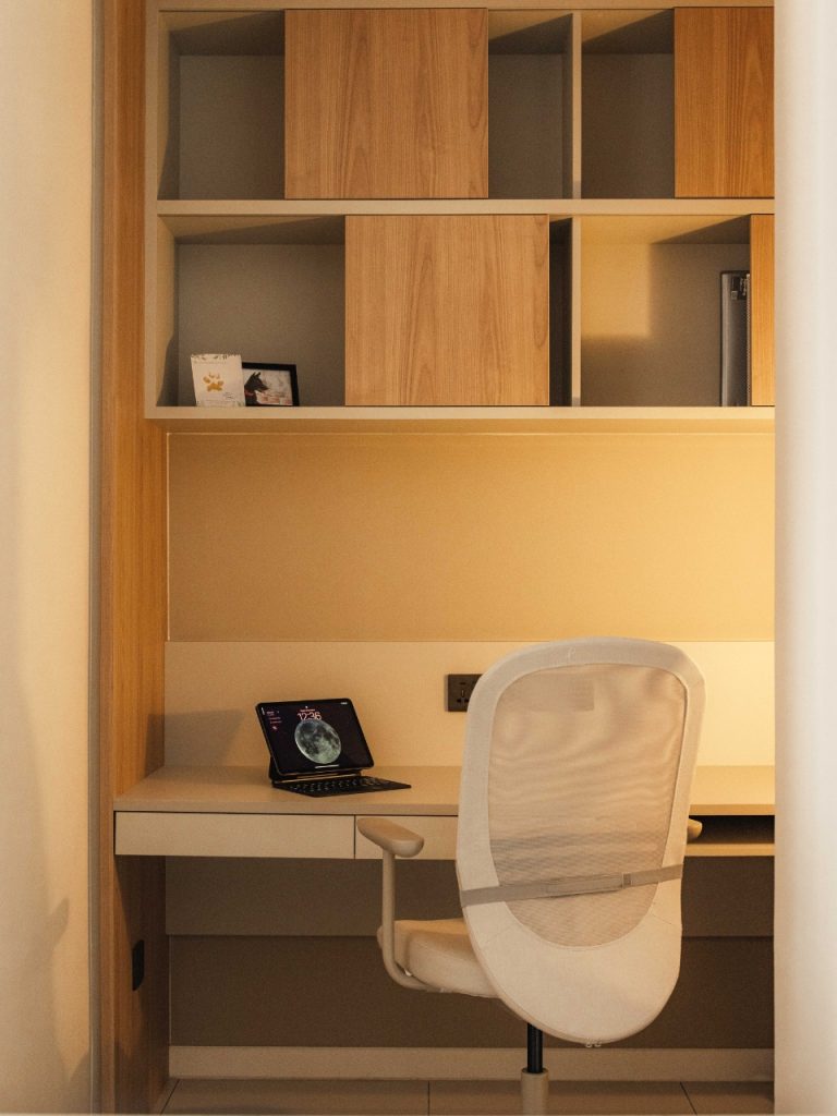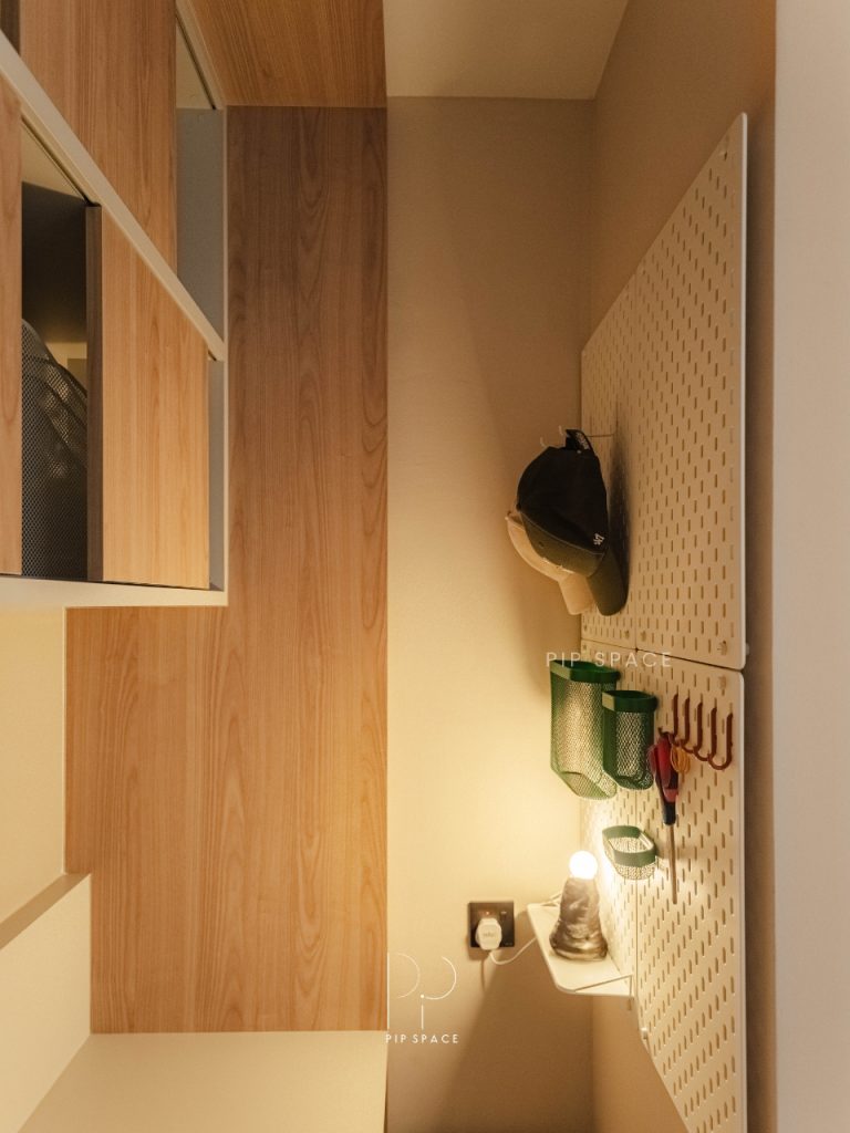 Instead of using the area behind the front door for ordinary shoe cabinets, it was turned into a compact study corner. This way, the space welcomes the owner with purpose, not just storage.