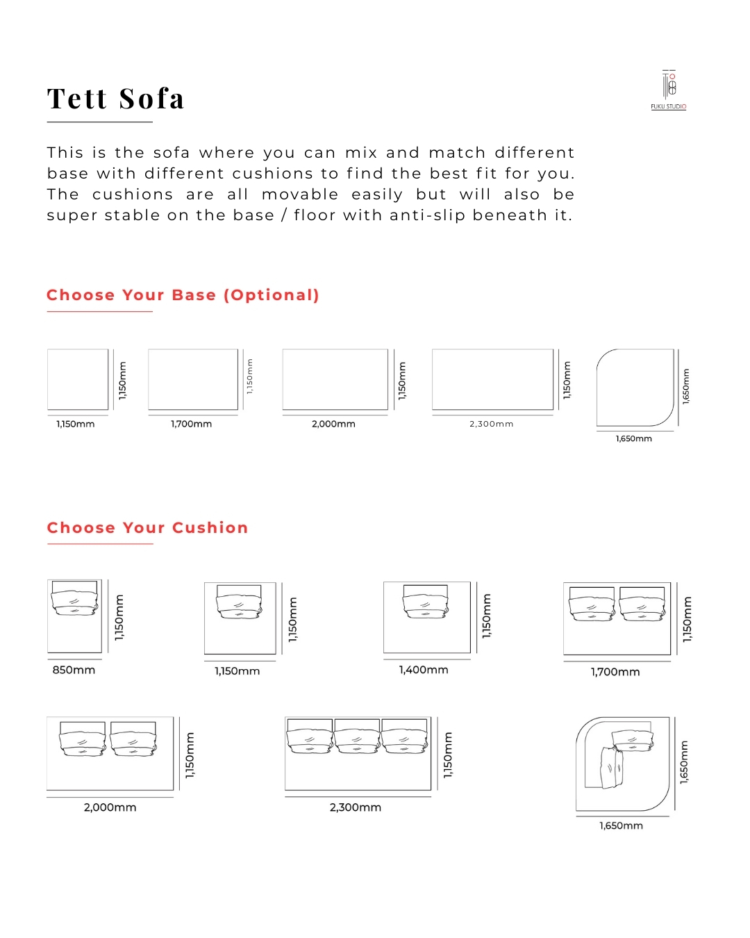 A sofa inspired by our childhood game — Tetris. Plug and match cushions the way you like it. Tett sofa is designed to be reconfigured and suit every moment of your life — from daily lounging to unexpected guests. Start with the base on the sofa then choose the cushion that fits your lifestyle. Check out the different base sizes and seat cushions available.